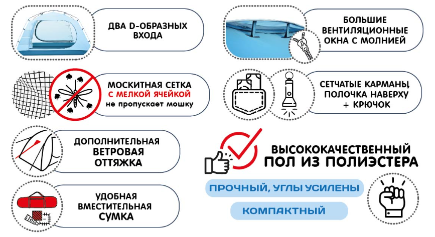 - уникальная конструкция даёт прирос +20% к объёму палатки при незначительном увеличении веса